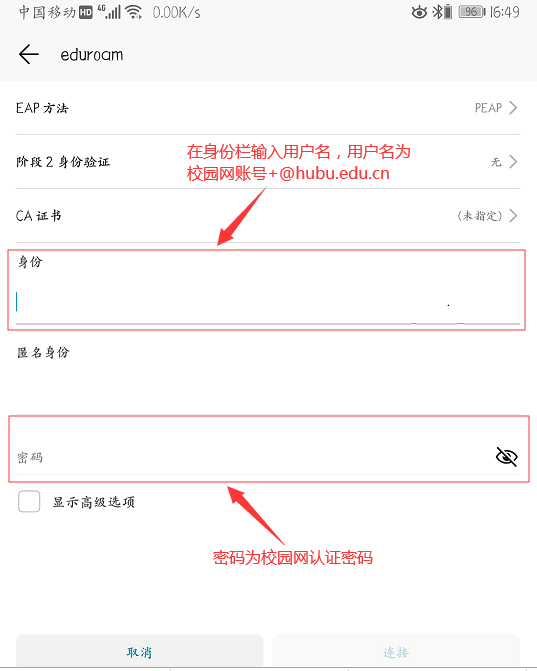 必赢官网师生在访问eduroam联盟的高校或学术组织时,用户名为:学号或工号+@hubu.edu.cn(认证时请务必添加“@hubu.edu.cn”后缀,否则将不能正常使用,例如:20040000@hubu.edu.cn)。密码为:校园网认证密码(请妥善保管,切勿外传)。