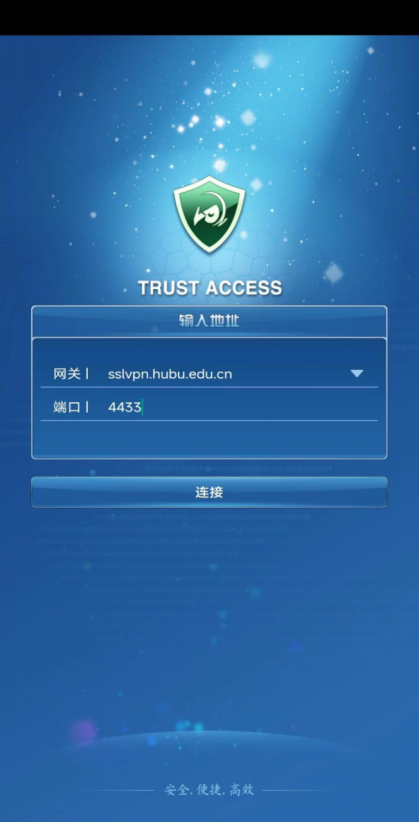 打开安装好的VPN快捷方式,网关输入sslvpn.hubu.edu.cn;端口填写4433,点连接。