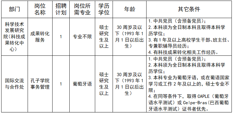 根据学校事业发展需要,现面向社会公开招聘管理岗位工作人员2人,其中科学技术发展研究院(科技成果转化中心)1人、国际交流与合作处1人。
