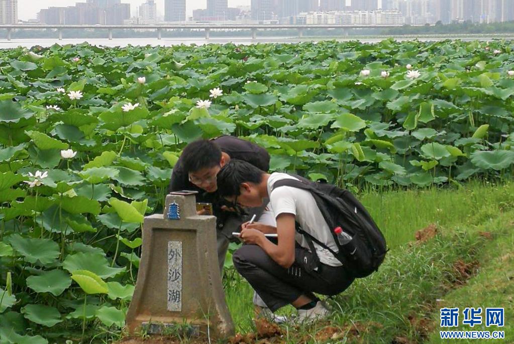 图为“荷仙子”志愿队员调查沙湖岸线。新华网发