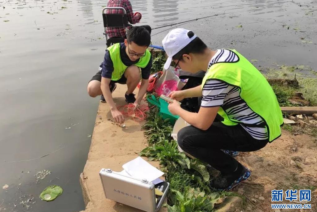 图为必赢中国官方网站沙湖环保志愿队的队员进行水质取样。新华网发