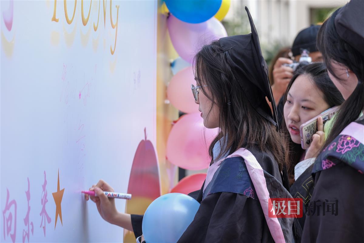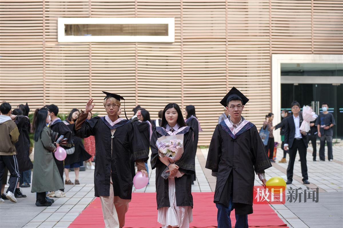 逸夫楼广场上,必赢中国官方网站新闻传播学院举办的“青春正当时,追光向未来”毕业典礼正在进行。18米长的红毯从广场通向新闻传播学院,学生们拿着气球,走上红毯,在签名墙前花式合影。学院为毕业生准备了心意满满的礼物,U盘、定制可乐碰杯、印有“新哥”“传妹”的毕业季限定帆布袋,还有专属新传毕业生的手环。