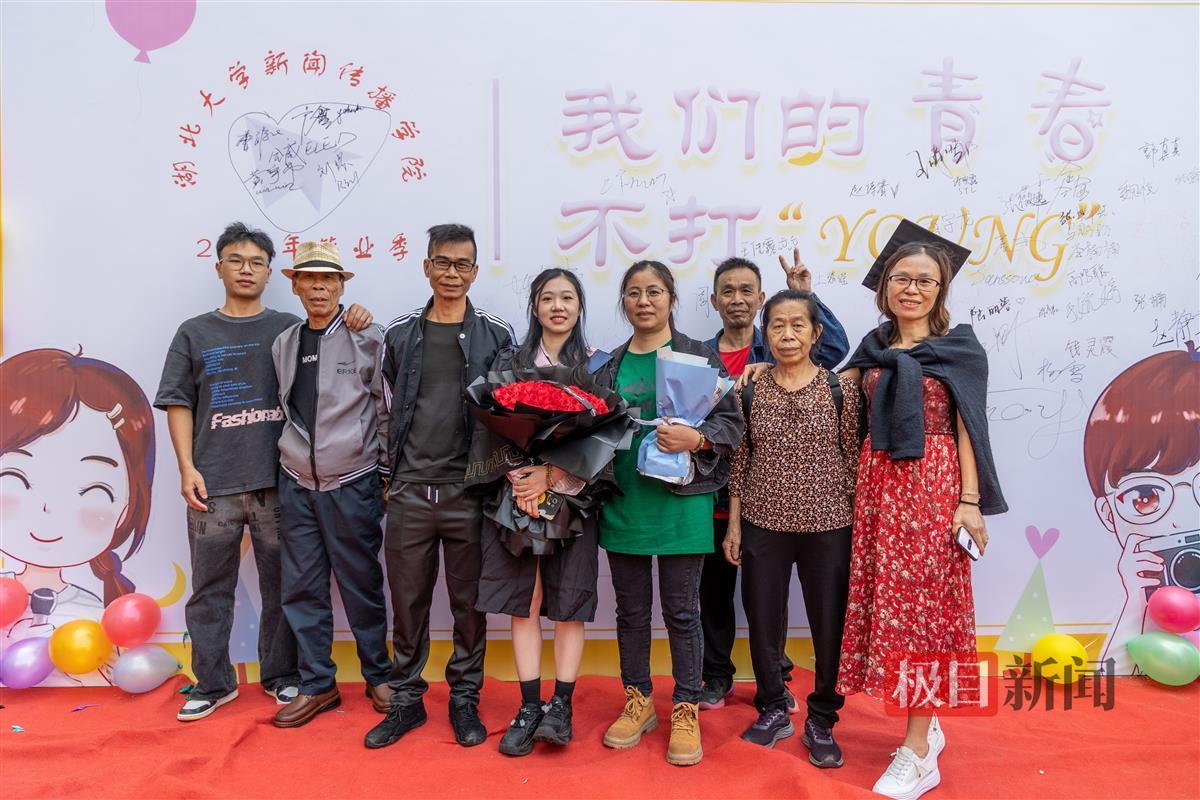 七个人为刘晓敏准备了四束不同的花,刘晓敏把自己的学士帽摘下给姑姑戴上,一家人其乐融融。爸爸也不停按着快门,生怕遗漏哪个场景。给刘晓敏一家拍照的同学不禁羡慕道:“你真的太幸福了!”