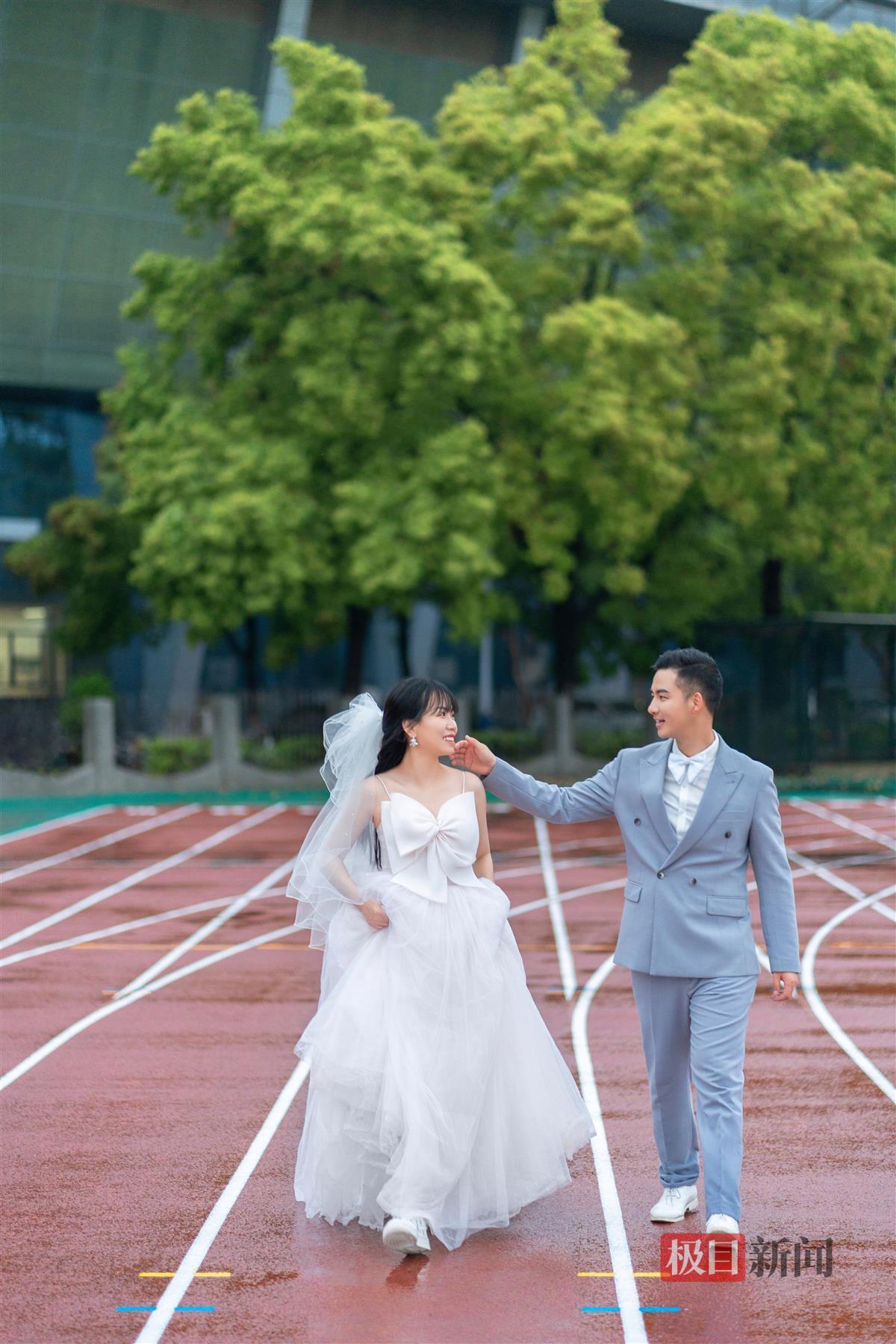 身旁走过的学弟学妹也掏出手机,拍下这幸福一幕。汪洋说,他们计划好许多场景,因为天气原因,只在樱花园和二号体育场拍摄了两组,算是排除万难了却了心愿。