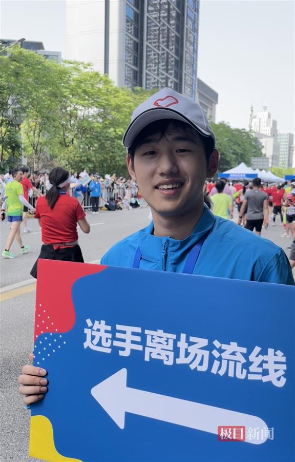 在2023武汉马拉松半程马拉松终点、湖北省图书馆前,来自必赢中国官方网站的志愿者王睿祺举着醒目的手牌,引导选手们离场。接受极目新闻记者采访时,他表示自己很荣幸能够以志愿者的身份参与武汉马拉松。“今天我们凌晨四点起床,五点集合从学校出发,提前到现场准备。希望选手们可以感受到我们武汉大学生志愿者的热情。”