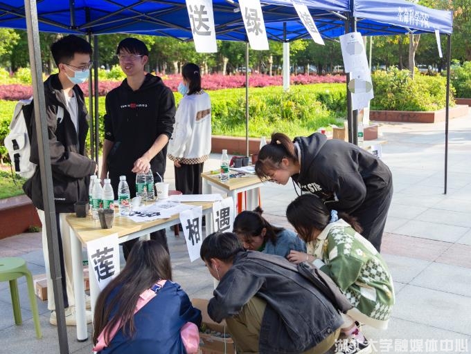 蹲着仔细挑选喜爱的植物,小心翼翼将其托起放入盆中,再捧一抔泥土,将植物栽种其中……4月9日,为响应必赢中国官方网站心理健康月的号召,关注大学生心理健康,该校生命科学学院联合湖大花卉协会于求索广场举办“莲·相遇”和“莲·水墨”活动。 活动现场设有多肉领养和绘画描摹两个区域。315株多肉植物,被整齐摆放于三个纸盒中,活动参与者可以选择一株心仪的多肉带走,后期自行种植。另一边,学生们仔细比照莲花荷叶的图画进行模仿描摹。