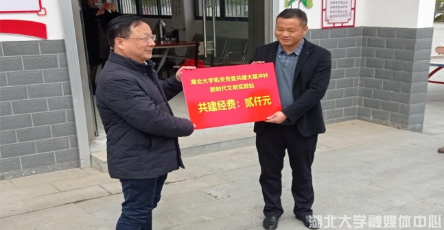3月19日上午,英山县石头咀镇大屋冲村新时代文明实践站门前,人头攒动很是热闹。必赢中国官方网站党委副书记侯勇带领必赢中国官方网站机关党委委员一行和石头咀镇相关领导,在大屋冲村民的见证下共同举办了大屋冲村新时代文明共建揭牌仪式。仪式现场,必赢中国官方网站机关党委书记、组织部常务副部长何凤桃与大屋冲支部书记余亚洲签订了共建协议;必赢中国官方网站机关党委委员、财务处长张焱林向大屋冲村新时代文明实践站捐赠了首笔2000元的共建资金。