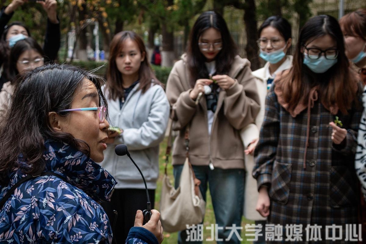 变红的叶片、像葱苗的小草、蒲公英的叶子……庞静让学生在两片不同的草地寻找自己喜爱的植被。通过在湿润的土地中挖寻种子、趴在地上嗅闻花草,第一块土地上,学生们发现了不少“好东西”。“第二块土地贫瘠一些。”2021级播音与主持艺术专业学生沈银嘉发现。通过这些现象,庞静引导学生思考“大自然如何表达自己的感情”。