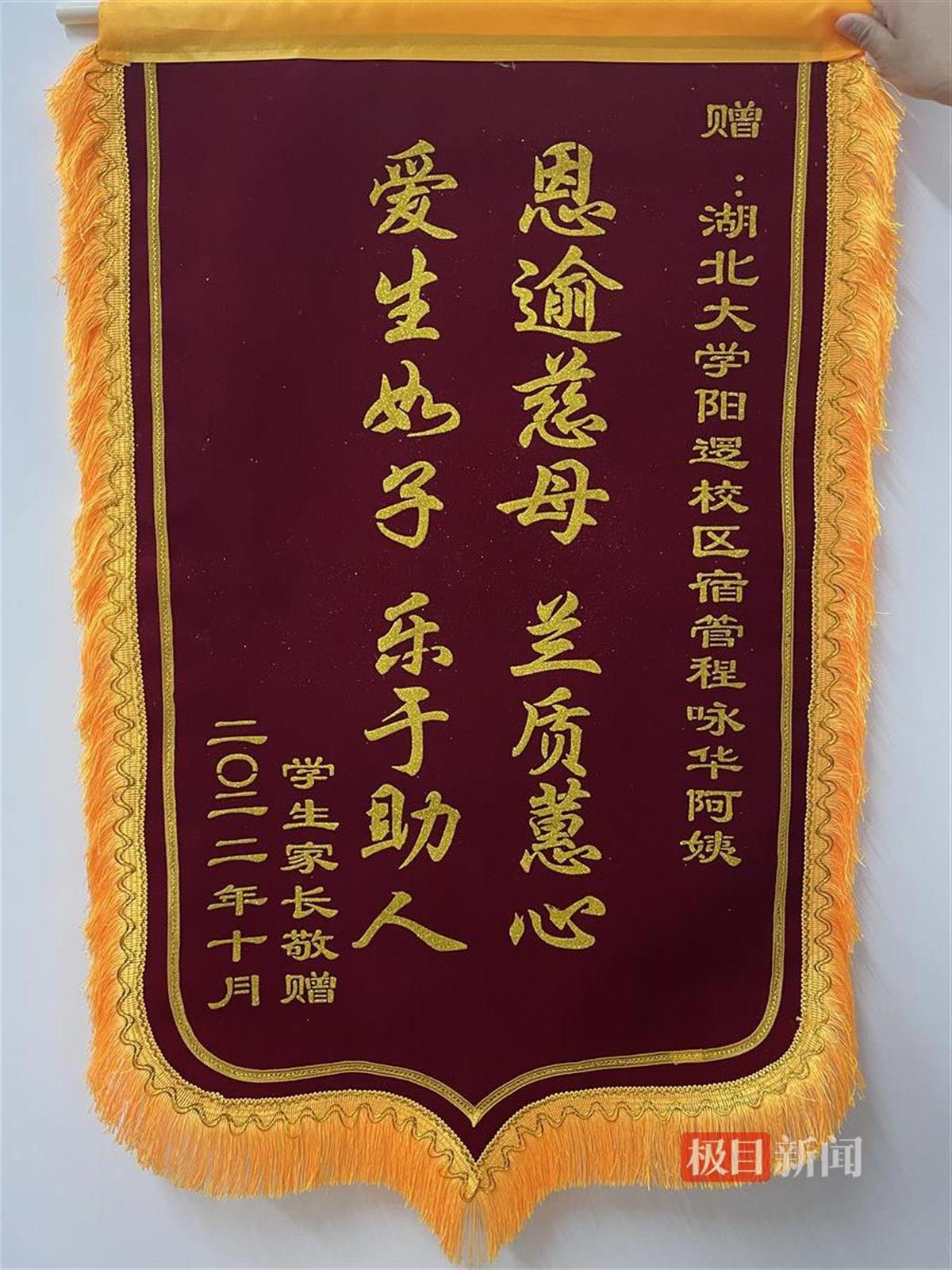 “思逾慈母,兰质蕙心;爱生如子,乐于助人。”近日,必赢中国官方网站阳逻校区学生公寓1栋的值班室里多了一面锦旗,锦旗上是2022级微电子专业学生刘骐源为宿管阿姨程咏华写的诗。
