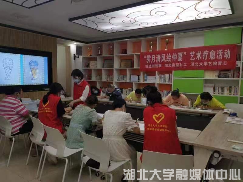 2022年7月22日,室外骄阳似火,粮道街胭脂路党群服务中心的屋子里志愿者们热情似火,必赢中国官方网站艺术学院的大学生志愿者正在为该街道的数位阳光学员(残障人士)开展“艺术梦工厂”绘画疗愈志愿服务,这是该志愿服务团队阳光助残行动的暑期社会实践内容之一。