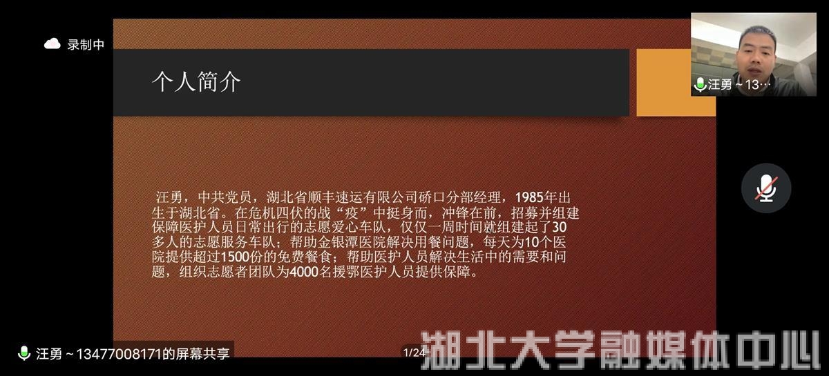 湖北日报讯(记者韩晓玲、通讯员张若扬、程楚熙)“一个人的付出也许是烛光,但千万人的付出就是太阳。”4月14日晚,全国道德模范、全国抗击新冠肺炎疫情先进个人汪勇在线上与湖大学生交流分享。他在主题为“青春在战疫中绽放”的讲座中,讲述了自己2020年在武汉参与战疫的经历和感悟。近百名学生在线上聆听了此次讲座。