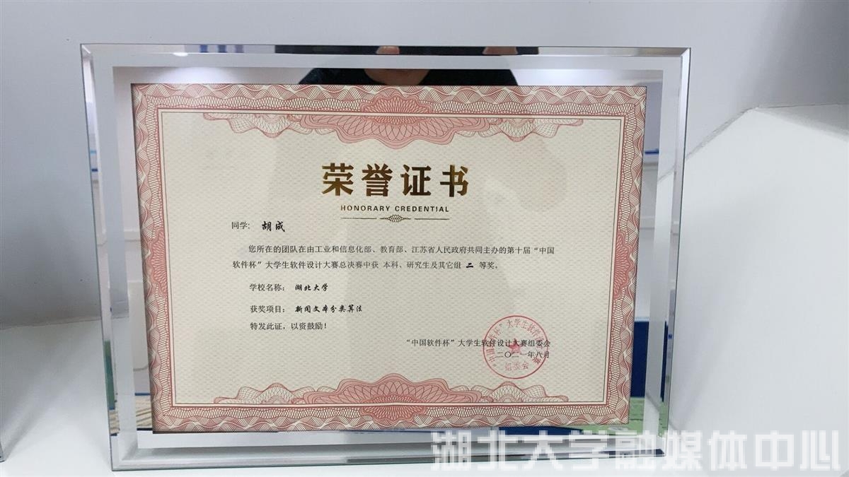 今年7月,胡成与张阳等人一起参加了“中国软件杯”大学生软件设计大赛。零经验的他们与导师、前辈反复交流,在不断摸索中推动课题向前推进。他们在实验室撑起了支架床,累了便躺下草草休息一会。小小的实验室,成了团队几人的另一个家。功夫不负有心人,最终他们获得了国家二等奖的好成绩。