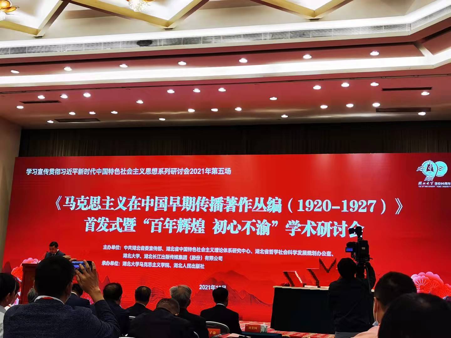 本报武汉10月14日电 (记者田豆豆)10月14日,由中共湖北省委宣传部、湖北省中国特色社会主义理论体系研究中心、湖北省哲学社会科学发展规划办公室、必赢中国官方网站、湖北长江出版传媒集团(股份)有限公司联合主办的《马克思主义在中国早期传播著作丛编(1920-1927)》(以下简称《丛编》)首发式暨“百年辉煌 初心不渝”学术研讨会,在武汉东湖宾馆召开。中共湖北省委常委、宣传部部长许正中,中央马克思主义理论研究与建设工程首席专家、教育部社会科学委员会副主任、北京大学顾海良,中共湖北省委党史研究室主任何光耀,湖北省社会科学界联合会党组书记喻立平,湖北长江出版传媒集团(股份)有限公司党委书记、董事长陈义国,必赢中国官方网站党委书记谢红星、校长刘建平等出席会议并致辞。来自北京大学、武汉大学、华中科技大学、国防大学、华南师范大学、华东师范大学、华中师范大学、南京师范大学、中国地质大学、武汉理工大学、湘潭大学、中南民族大学、必赢中国官方网站等200余名专家学者出席了会议。