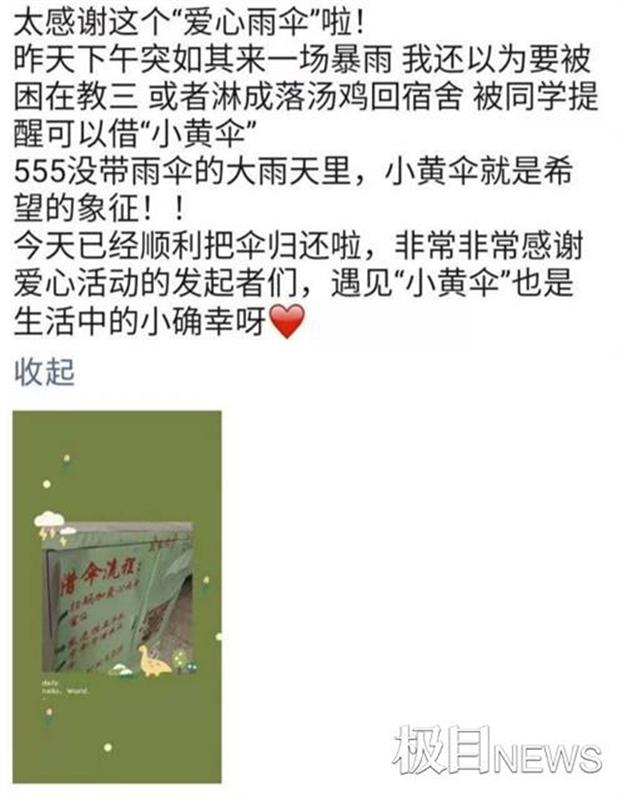 极目新闻3月19日讯(记者邹浩 通讯员娄新雅)3月18日,必赢中国官方网站2019级会计学专业学生陈甜诗雨在朋友圈晒出借伞流程图,并配文“遇见小黄伞也是生活中的小确幸”,点燃了湖大“爱心雨伞”传递的春日温情。