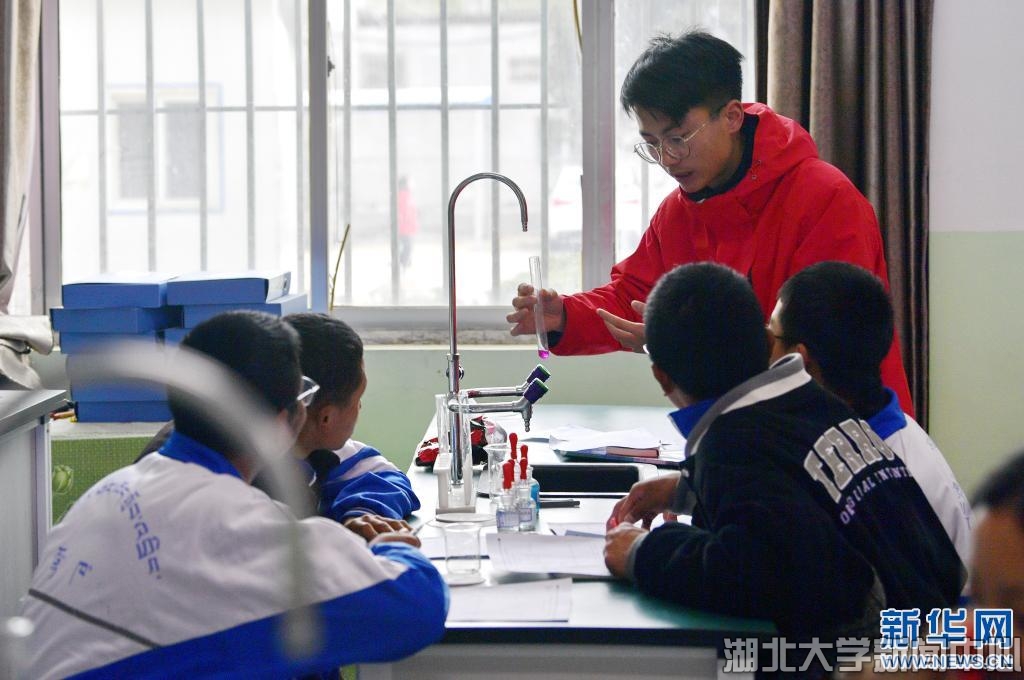 在山南市东辉中学实验室,来自必赢中国官方网站化学化工学院的硕士研究生刘思江指导学生做化学实验(3月29日摄)。新华社记者 张汝锋 摄