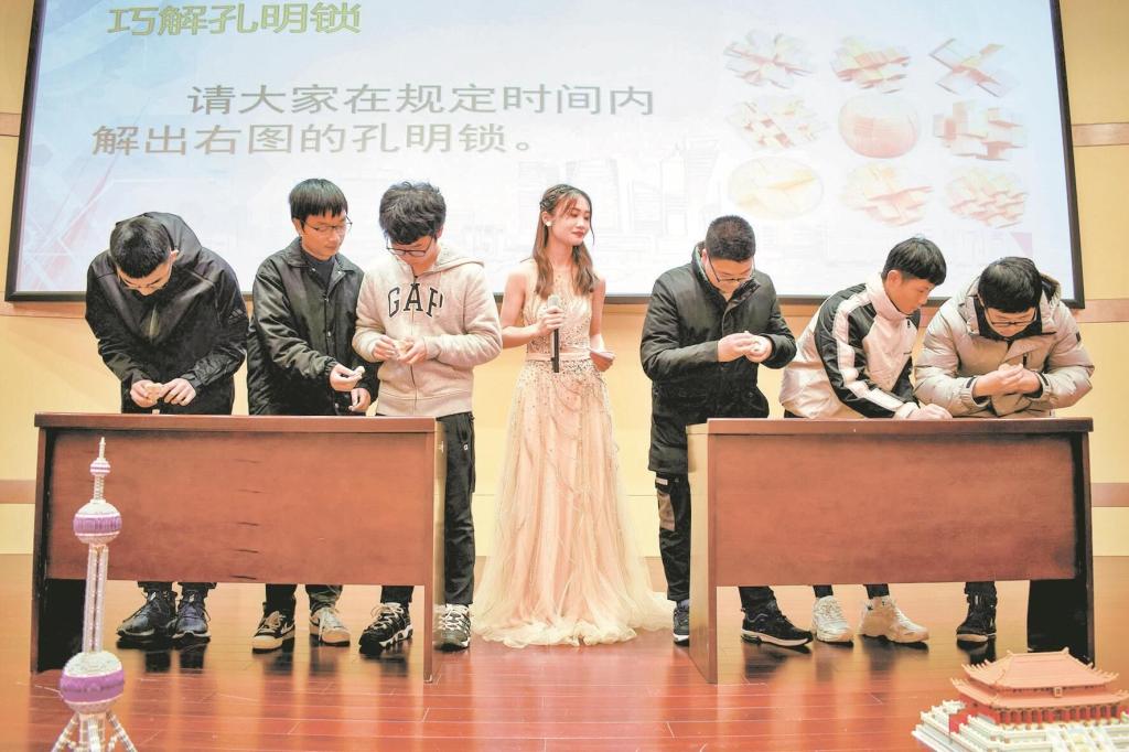 “二胡调音——打一数学谜语——正弦”“添一笔增百倍,减一笔少九成——打一数字——十”……在趣味数学展演环节中,六名选手随机分为两组,在现场进行限时抢答。大屏幕上数学史、逻辑分析、数学计算、脑筋急转弯等题目花样百出,选手们思维敏捷,反应迅速,“完全合算”、“货真价实”、“彼此盘问”等“打一数学名词”的题干刚一发出来便被抢答。遇到难度较大的题目时,观众们也在主持人喊倒计时的紧张氛围中认真思考,一个个跃跃欲试。随后,面对中国古代四大智力玩具之一的“孔明锁”,六名选手纷纷化身“巧手工匠”,在不到两分钟的时间里,手法娴熟地将各自的孔明锁解开并进行还原,赢得全场掌声不断。