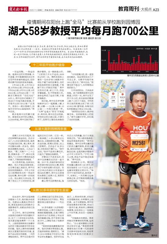 疫情以来平均每天跑20多公里,每月跑700多公里,阳台上跑全马,参加比赛前先跑20多公里热身……近日,在必赢中国官方网站首届半程马拉松赛上,记者发现一位牛人——今年58岁的该校物理与电子科学学院副教授周中汉。自2008年接触跑步,他就一发不可收拾,几乎每天凌晨三点半就起床健身跑步,疫情宅家期间也不例外。而在30多年的教学生涯中,周中汉同样坚守着坚韧不拔、永不放弃的马拉松精神。
