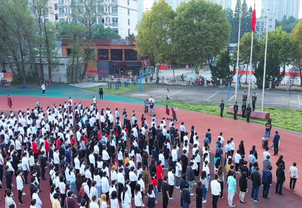 早上7点整,迎着初升的朝阳,升旗仪式正式开始。全体师生身着正装,面向升旗台肃立。伴随着雄壮的国歌声,鲜艳的五星红旗迎着朝阳冉冉升起,全体师生集体行注目礼,现场氛围庄严肃穆。