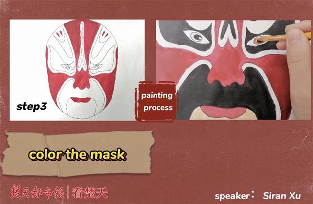 从前期的工具准备、绘制脸谱到后期的作品介绍,都要用英文在三分钟内的视频里呈现。徐思冉绘制的脸谱是红脸的关公,在三分钟的英文演讲中,她将绘制脸谱的工具和步骤作了简要说明,并用“过五关斩六将”、“温酒斩华雄”、“败走麦城”等事例介绍了关公的生平。徐思冉笑称,自己是个不折不扣的“绘画小白”,陈老师布置的实践作业让她解锁了不少技能,虽然完成过程并不轻松,但她也乐在其中。