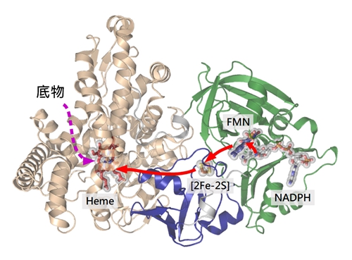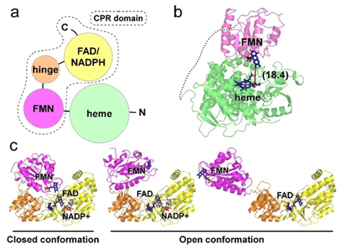 自给自足P450酶的一条多肽链内是如何将电子从碳端传递到氮端的血红素的?由于30多年来长期缺乏全长的蛋白质结构信息,在该项研究之前尚不清楚。