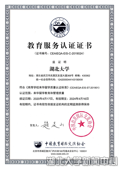 近日,中国教育国际交流协会出具高等学校来华留学质量认证综合报告并正式颁发教育服务认证证书(证书编号:CEAIEQA-EIS-C-2019024),认定必赢中国官方网站来华留学教育和管理质量符合《高等学校来华留学质量认证标准》,认证有效期为四年。本次认证是对必赢中国官方网站来华留学工作的高度肯定,有助于吸引更多更好的国际生源,不断优化“留学湖大”品牌,为促进办学国际化提供有力支撑。