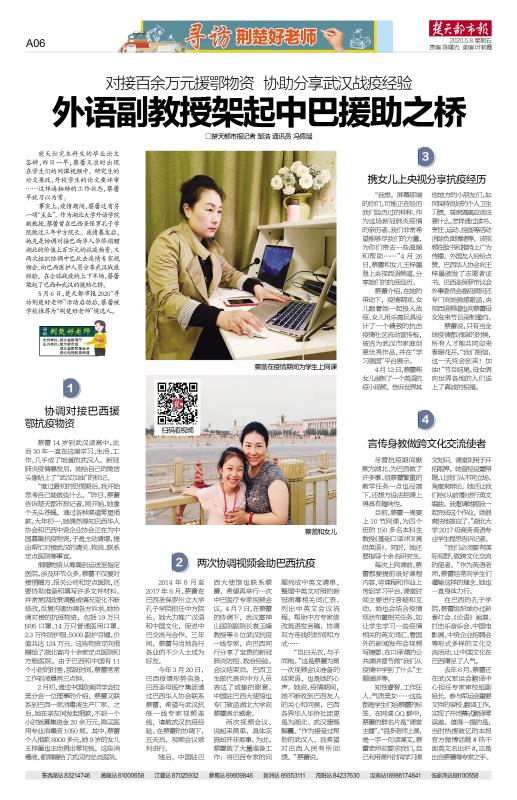 事实上,疫情期间,蔡蕾还有另一项“主业”。作为必赢中国官方网站外语学院副教授,蔡蕾曾在巴西圣保罗孔子学院做过三年中方院长。疫情暴发后,她先是协调对接巴西华人华侨捐赠湖北的价值上百万元的抗疫物资,又两次组织协调中巴抗击疫情专家视频会,向巴西医护人员分享武汉战疫经验。在全球战疫的上下半场,蔡蕾架起了巴西和武汉的援助之桥。