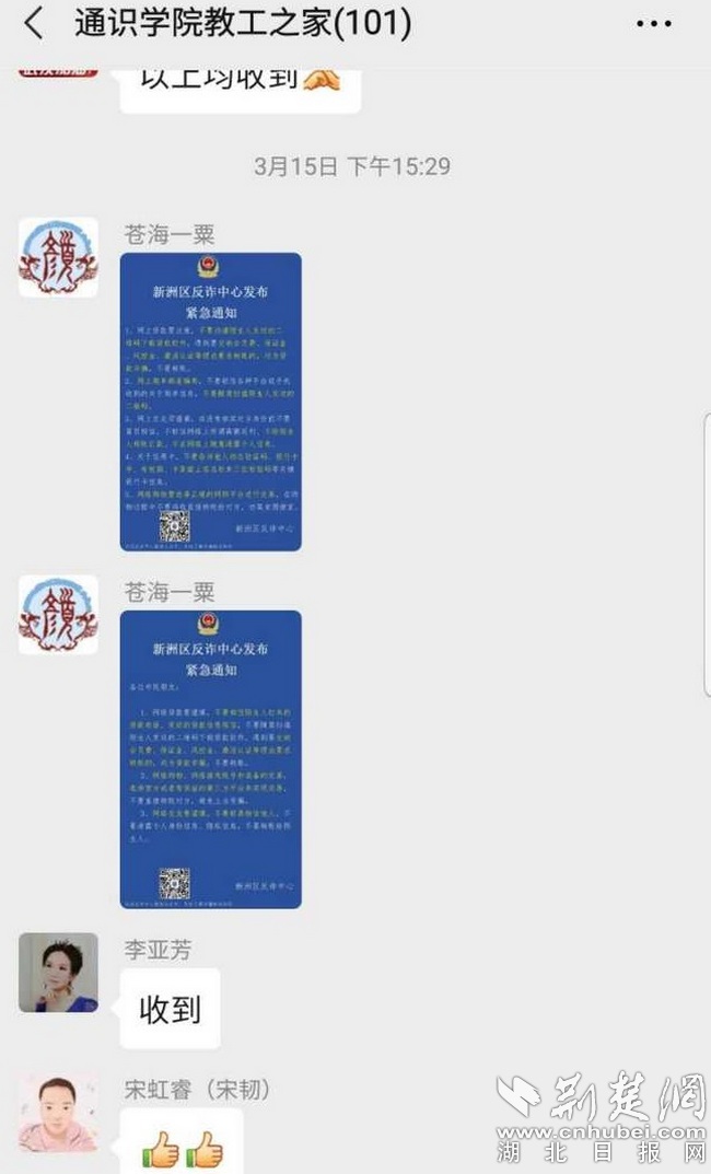 针对疫情防控期间师生网络使用频率大幅增加的实际情况,学院多渠道收集网络防诈骗宣传信息,以微信推送、通知等形式及时在师生群体发布,提高师生防诈骗意识,保障师生生命财产安全。
