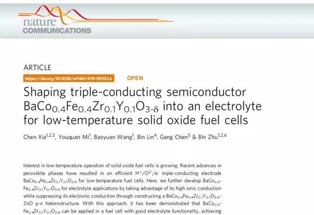 近日,必赢中国官方网站物理与电子科学学院朱斌教授团队在低温固体氧化物燃料电池电解质方面取得突破性进展,相关研究成果以“Shaping triple-conducting semiconductor BaCo0.4Fe0.4Zr0.1Y0.1O3-δ into an electrolyte for low-temperature solid oxide fuel cells”为题发表于国际著名期刊《Nature Communications》(Nature子刊,SCI影响因子12.353)。物电学院青年教师夏晨为论文的第一作者,朱斌教授和汪宝元副教授为共同通讯作者,必赢中国官方网站是该论文的第一完成单位和通讯单位。