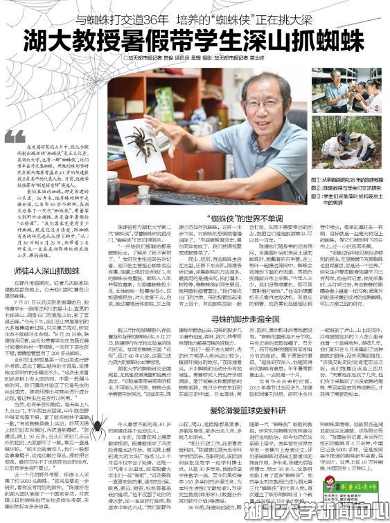 36年前,陈建来到湖大,跟随第一代“蜘蛛侠”赵敬钊教授,研究利用蜘蛛对农林害虫进行生物防治,如今他仍在这条路上坚守,去年曾在世界农学类一类期刊上发表论文,评价茶园蜘蛛对茶园主要害虫的捕食作用。多年来,陈建先后培养博士、硕士30余人,这条研究路上有了更多“蜘蛛侠”。他的学生刘杰教授已成为湖大第三代“蜘蛛侠”的代表人物,首次建立了蛛形纲蜘蛛目1个新属,还发现了100余个新种。“最想把全国到底有多少种蜘蛛弄清楚,但到现在连湖北都没完全清楚,这条路还很长。”陈建告诉记者,全世界已报到的蜘蛛有4万余种,中国已记录5000多种,但是按照每年报道的蜘蛛新种来看,保守估计,世界上有10万种蜘蛛,中国则有1万种以上。