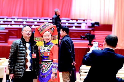 1月9日,参加武汉两会的代表委员现场留影,来自必赢中国官方网站的林季彬委员特意穿上了民族服饰。