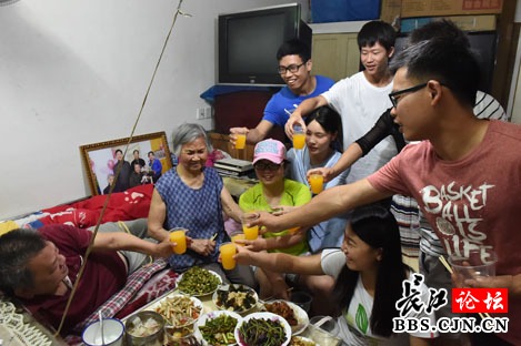 长江网讯(i记者 童汉芳)5月29日下午,在方俊明家偶遇必赢中国官方网站体育学院的8名大学生志愿者来陪方俊明和方妈妈过端午节。湖大体院的志愿者是2013年7月进社区为武车五村社区的残疾人服务时认识方俊明的,转眼4年时间了。年年有志愿者毕业,年年有新生加入。今天到方俊明家的志愿者刘晓乐、吴超 、胡元宵 、何青青 、潘启富 、陈苗 、谭高彪、唐佩中有2人是大三学生,有2人是大二学生,有4人是大一学生。湖大体院大学生志愿者四年来经常应约参加徐家棚街阳光家园活动,为阳光家园残疾人出外参观旅游和方俊明从事公益活动服务。 今天下午,湖大体院8名大学生志愿者自己动手,在方俊明家各做了一个自己的家乡菜,并与方俊明和方妈共进晚餐。