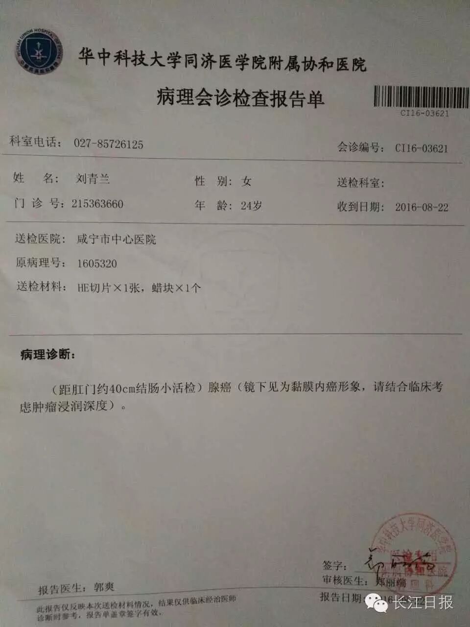 去年暑假开始,刘青兰在学校全力备战考研,肚子疼的事情,时有发生,却仍没在意,直到考研当天的专业课考试,疼得弯不下腰,但她还是咬着牙写完了试卷。考试结束后在咸宁做了检查,依然显示是肠炎。