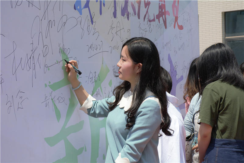 走完红毯,毕业生们在留念板上签字,为了签在最高处,男生们组成一个个“叠罗汉”小组,不断喊起“一二三,起!”的口号,引起笑声一片。