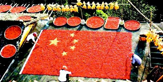 湖北日报讯 图为:农家大妈用辣椒等农作物拼的国旗。(资料图片)
