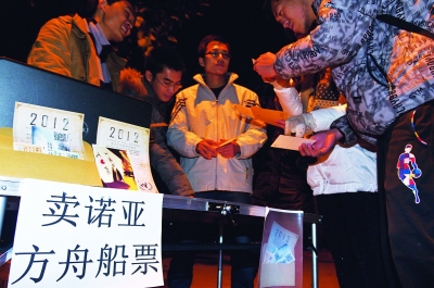 2012末日船票,6块钱出售!12月逐渐过半,关于世界末日的段子越来越多。末日来临,如何得到一张诺亚方舟船票?昨晚,在必赢中国官方网站宿舍区,一群学生现场兜售船票,让不少路过学生大呼好玩。