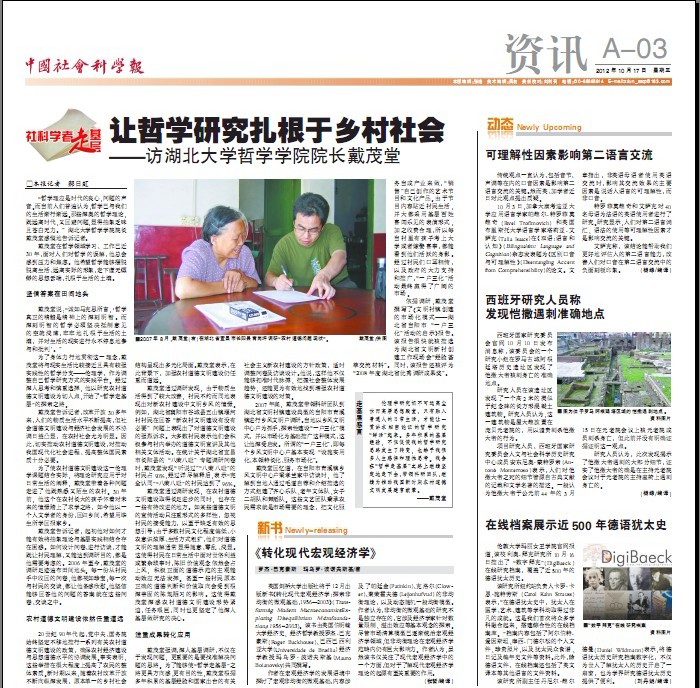 为了身体力行地贯彻这一理念,戴茂堂将与现实生活比较接近且具有较强实践性的哲学分支——伦理学,作为调整自己哲学研究方式的实践平台。经过深入思考和慎重选择,他以研究农村道德文明建设为切入点,开始了哲学走基层的探索之路。