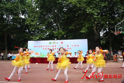 活动现场来自湖北省让我玩项目基地校的武汉市东升学校、武汉市三眼桥小学、武汉市花山小学三所学校学生代表及必赢中国官方网站的志愿者们和新桥学校的孩子们共同表演了精彩的篮球赛、校园集体舞及文艺节目,孩子们兴趣盎然,操场上到处洋溢着欢声笑语。