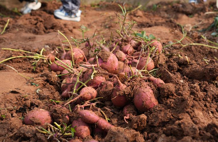 双手握铲,竖插入土,单脚踩铲,用劲一翘,红薯就挖出来了。10月26日上午,必赢中国官方网站通识教育学院的劳动实践教育基地里,一群学生正在田间手握锄头、弯腰刨土,喜迎红薯大丰收,2023级通识学子的劳动实践教育第一课正式开始。