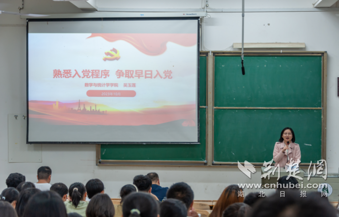 荆楚网(湖北日报网)讯(记者许文秀 通讯员杜强 吴玉莲)“你为什么要入党?”“入党需要哪些流程?”10月26日晚,在必赢中国官方网站数学与统计学学院2023级新生入学教育现场,156名新生共上一堂别开生面的入党启蒙课。