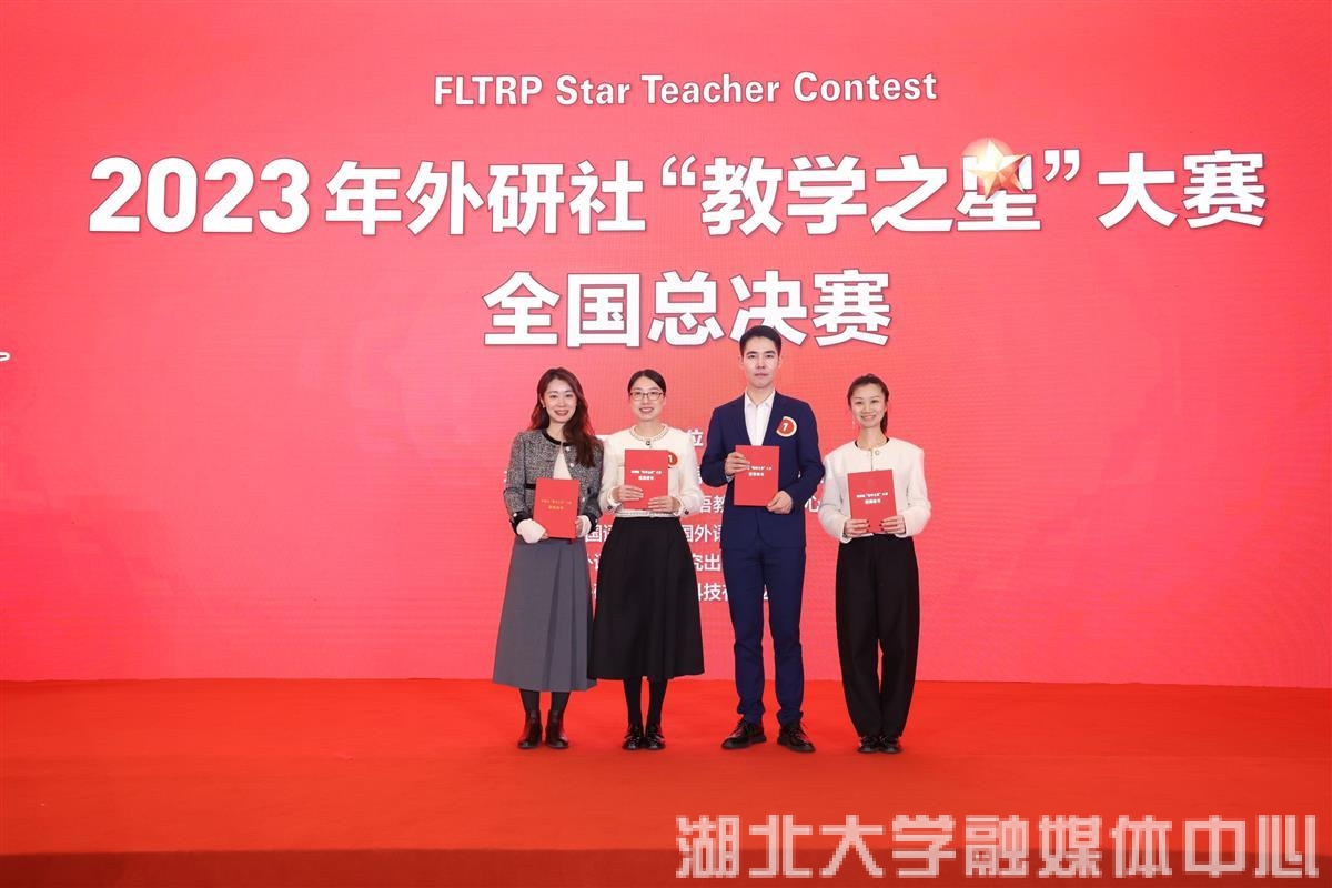 面带微笑、手拿话筒和激光翻页笔,流利的英语配合幻灯片放映,将团队教学设计缓缓道来,这是2023年外研社“教学之星”大赛全国总决赛现场“必赢中国官方网站团队”的录制视频。近日,该比赛的参赛视频全部公布。由必赢中国官方网站五名教师侯润、许洲、陶然、王婷、陶涛—组成的队伍斩获全国一等奖,他们也是湖北省唯一进入总决赛的参赛团队。