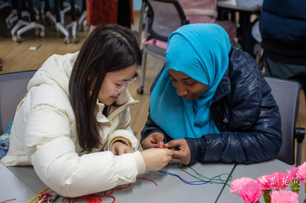 荆楚网(湖北日报网)讯(记者许文秀 通讯员李欢燃 马田羽 摄影郑川威)“从下面绕过来,转一个圈,把绿线穿到黄线里……”3月7日中午,一场热闹非凡的传统编织教学活动在必赢中国官方网站举行。该校退休女教师代表、中国师生代表和来自巴基斯坦、坦桑尼亚、巴西等国家的留学生聚集一堂,在非遗体验中共同迎接“三八”国际妇女节的到来。