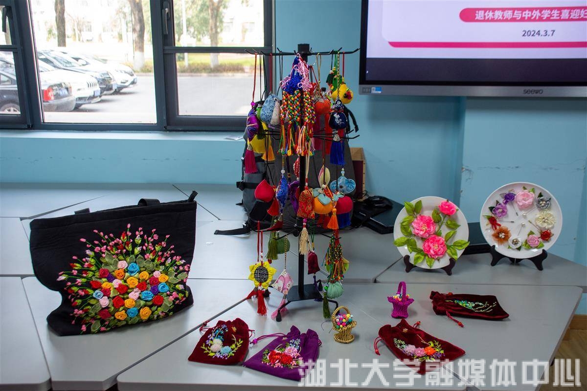 活动现场展示了老同志的手工艺品,有各种手机挂件、布包、小布袋、花盘、编织的小巧花篮等。布包和布袋上,手工制作的花卉精美逼真,洋溢着浓郁的春天气息。一件件精美的手工艺品吸引了中外学生,纷纷拿出手机拍摄。