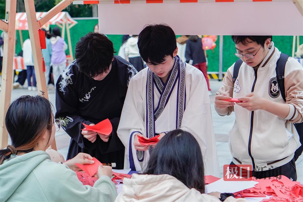 另一个高人气的摊位则是“剪韵流芳”。摊位上准备了若干红纸和数把剪刀,摊位前围满了跃跃欲试的学生,摊位负责人学生马骏飞告诉记者,剪纸是中国传统非物质文化遗产,为了让学生们能体验此项目,他们提前准备了许多教程,由难到易,各有涉及。“即使达不到古法剪纸的水准,也可以借此机会鼓励大家多多了解优秀的文化遗产”,马骏飞介绍,学生们都很享受剪纸的过程,咔嚓的清脆声响间,桌上已堆满剪纸作品,“还好我们的物资充足,不然一会儿就要用完了”。