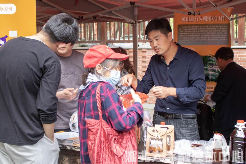 活动现场有一块特殊的摊位,这是湖北英山县石头咀镇大屋冲村、程早村等10个村及两家公司的湖大“首秀”。他们带来茶叶、油面、菜籽油、土蜂蜜等农产品,以优惠的价格参与展销,向湖大学子、师生出售。2022级英语(师范类)学生何雨晴在品尝了英山茗茶后,买下了两盒,“这茶味道不错!我买了也是给乡村振兴出力”。