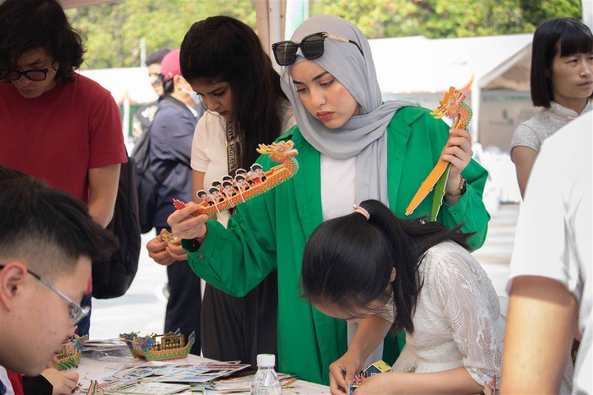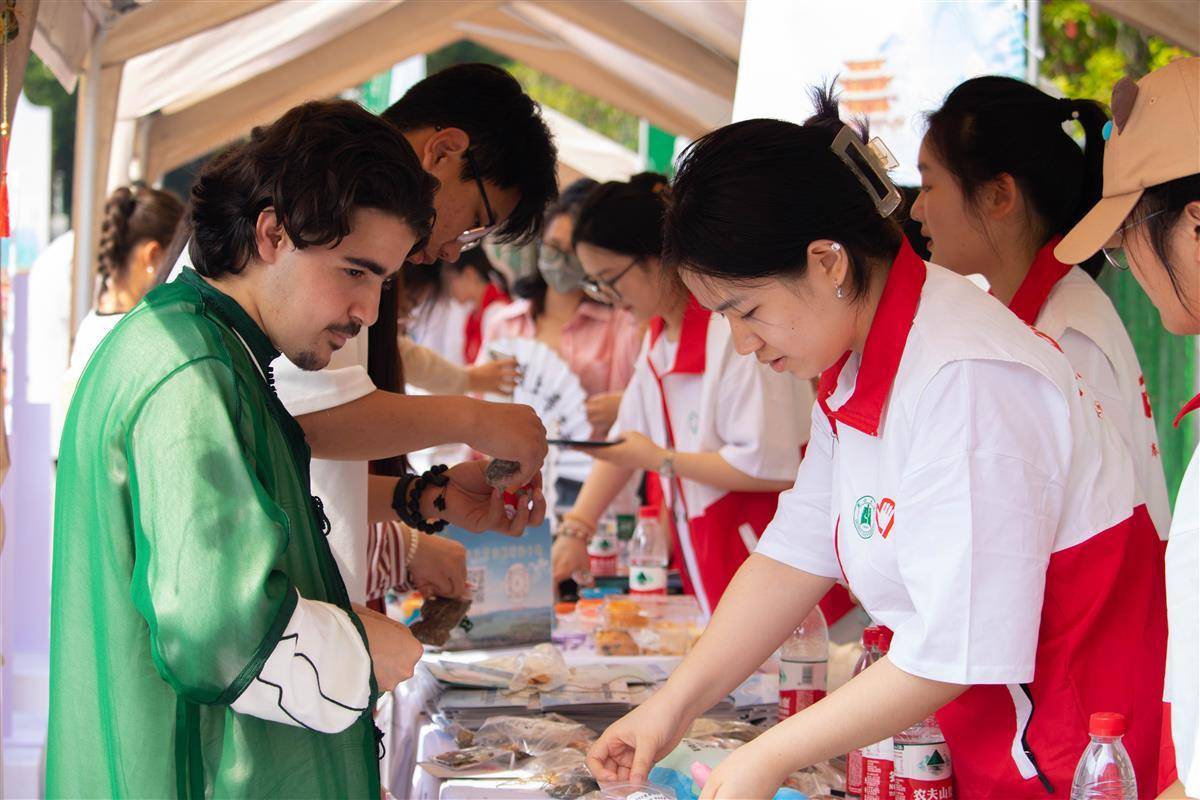 活动现场共设置12个荆楚文化展台,中外学子一起担任地方文化推荐官,分别介绍荆楚地域文化。中外学生排起长队,体验书法、剪纸、投壶等传统文化。国际学生专场招聘会吸引了20家企业参展,提供了百余岗位,现场人头攒动。