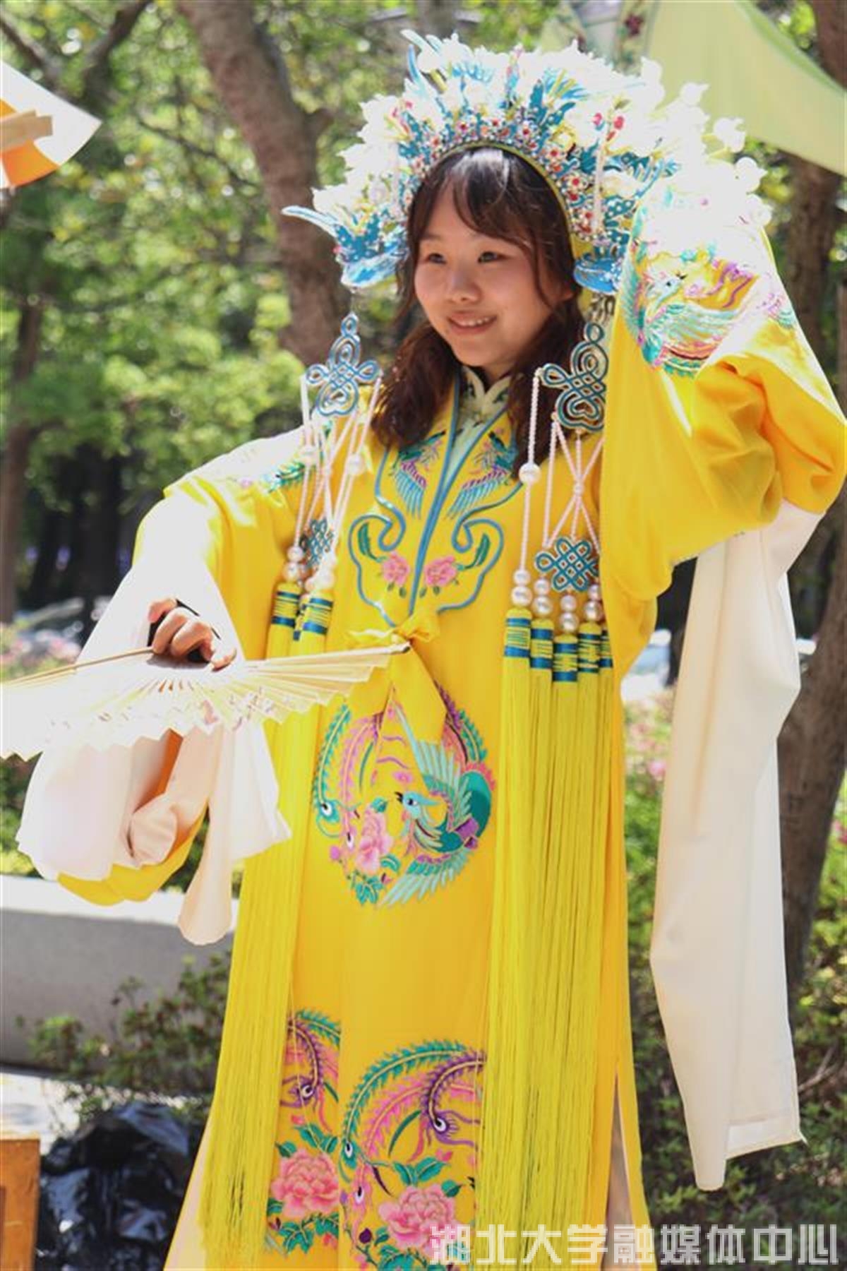 身着红色的戏服,手扶宽大的玉带……来自外国语学院的巴西籍教师Hernandes Miguel正在“梨园风采·戏韵华裳”摊位前体验中国戏曲服装。“我觉得中国的戏服很有意思,特别是中间这个圆形的腰带。”他兴趣盎然地分享“这次活动不仅让中国自己的学生加强对自己祖国传统文化的了解,也让我更加了解中国美学。”他还开心地跟学生合照,听学生们介绍自己摊位的相关活动。