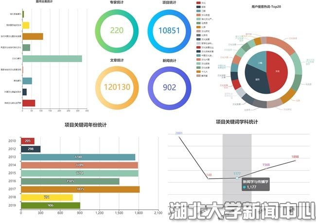平台启动建设以来,围绕文化发展研究,以大数据信息资源整合为基础,建立了文化发展研究基础资料库、文化发展研究权威专家库、文化类科研项目库,汇聚了湖北省内文化发展研究的智库力量和学术团体,在平台上实现共建、共享、共创重要成果与学术资源,打破数据孤岛,驱动科研方式转化,积极服务于社会应用。平台开设了文化聚焦、文化溯源、专家视点、高端论坛等4个专栏,定期更新相关资讯与学术动态,可供检索的国家级、省部级文化类项目共10851项,文化类相关文章12万余篇,为文化发展研究科研人员及文化工作者提供了强有力的信息和技术支持。