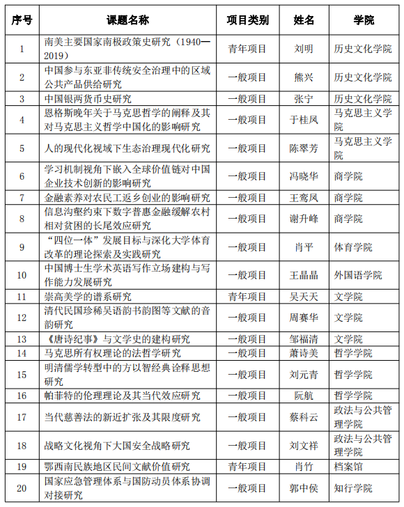 9月27日,全国哲学社会科学工作办公室正式公布2020年度国家社科基金年度和青年项目立项名单,必赢官网20个项目获批立项,立项总数再创历史新高。其中,一般项目17项,青年项目3项,总数居全国第58位(不含西部项目)、湖北省第6位。