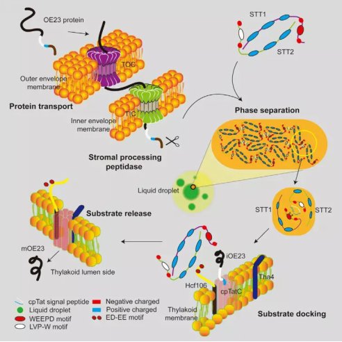 该研究发现了位于叶绿体基质的关键蛋白转运分选因子STT1与STT2,阐明了双精氨酸依赖转运途径的底物如何识别、分选以及如何转运靶定到双精氨酸依赖转运途径的分子机制。STT1与STT2蛋白都包含N端的IDR (intrinsically disordered region) 结构域与C端的ankyrin repeat结构域。STT1与STT2能够依赖于ankyrin repeat结构域的相互作用形成一个椭圆球状异源二聚体结构,而STT1与STT2的IDR区域分别含有保守的WEEPD基序与LVP-W基序,识别底物信号肽的双精氨酸(RR)基序与疏水结构域(H domain)。研究表明底物结合激活STT复合物进一步的组装相分离形成浓缩的液滴。STT-底物相分离液滴协助底物穿过叶绿体基质从而靶定到类囊体膜。而Hcf106能够抑制STT的相分离从而释放底物,完成底物的正确运输与装配。这种方式可能既能确保底物折叠,同时保持底物信号肽的活性便于被下游Tatc/Hcf106通道识别,阻碍STT-Hcf106结合会阻断Tat底物的运输,影响植物光合作用从而导致植物致死的表型。该研究首次发现了相分离调控叶绿体蛋白的运输,从而调控叶绿体生成和光合作用。同时该研究强调了相分离调控蛋白运输是在所有物种都存在的普遍机制。因此该研究同时拓展了相分离与蛋白运输的研究领域,也为研究细胞是如何精确调控其各种生理活动拓展了思路(见图2)。