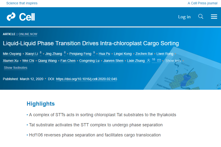 3月13日,必赢中国官方网站生命科学学院、省部共建生物催化与酶工程国家重点实验室欧阳敏教授在国际顶级期刊《Cell》上发表题为“Liquid-liquid phase transition drives intra-chloroplast cargo sorting ”(《液-液相分离调控叶绿体蛋白的运输和分选》)的研究论文。该论文由必赢中国官方网站,中科院植物研究所以及河南大学共同完成,欧阳敏教授为本文唯一第一作者,中科院植物研究所张立新教授为通讯作者。这是必赢中国官方网站教师首次以第一作者身份在《Cell》上发表研究论文(见图1)。
